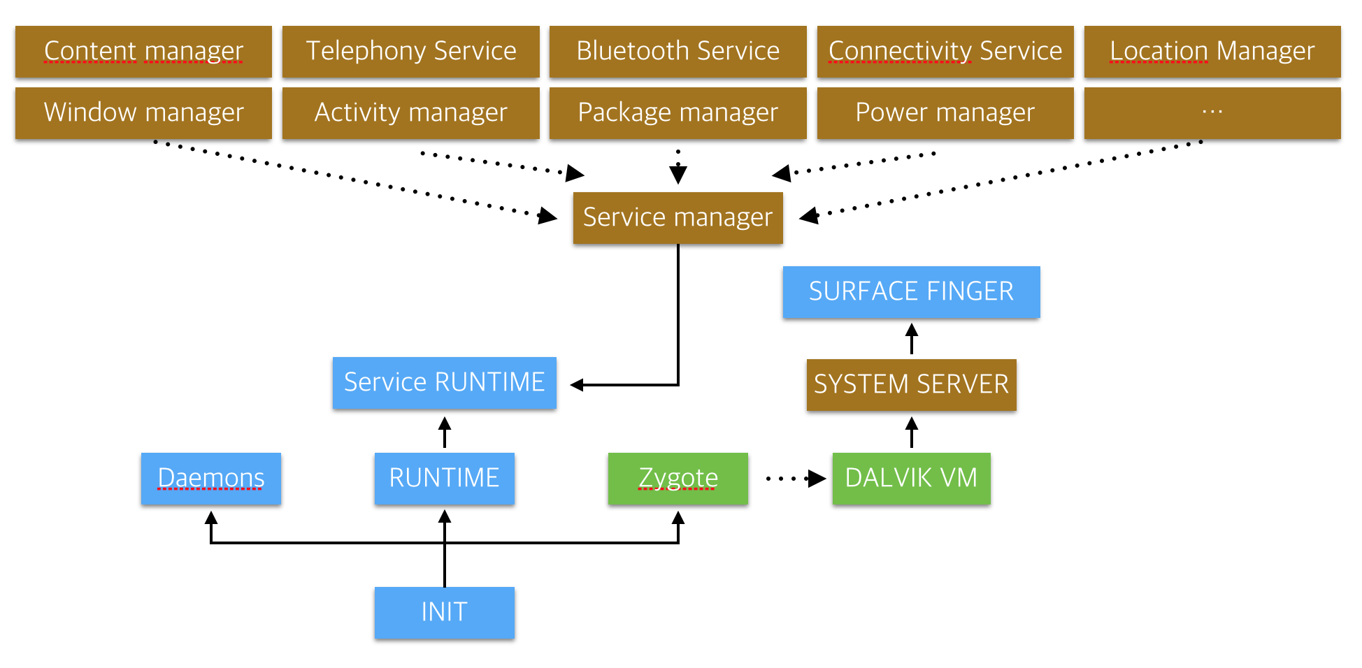 - 가상머신이 탑제되고 여기에 시스템 서버와 함께 시스템 매니저가 런타임환경을 통해 구동되기 시작한다. 그럼 다양한 서비스가 시작되어 애플리케이션이 구동할수 있는 환경이 만들어 진다.