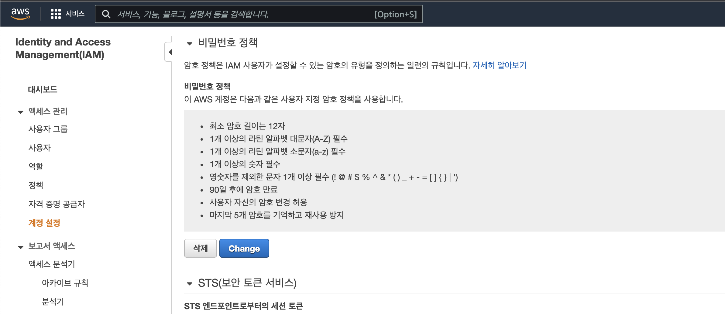 비밀번호 설정 정책은 [IAM - 계정 설정 - 비밀번호 정책]에서 확인 및 수정이 가능합니다.