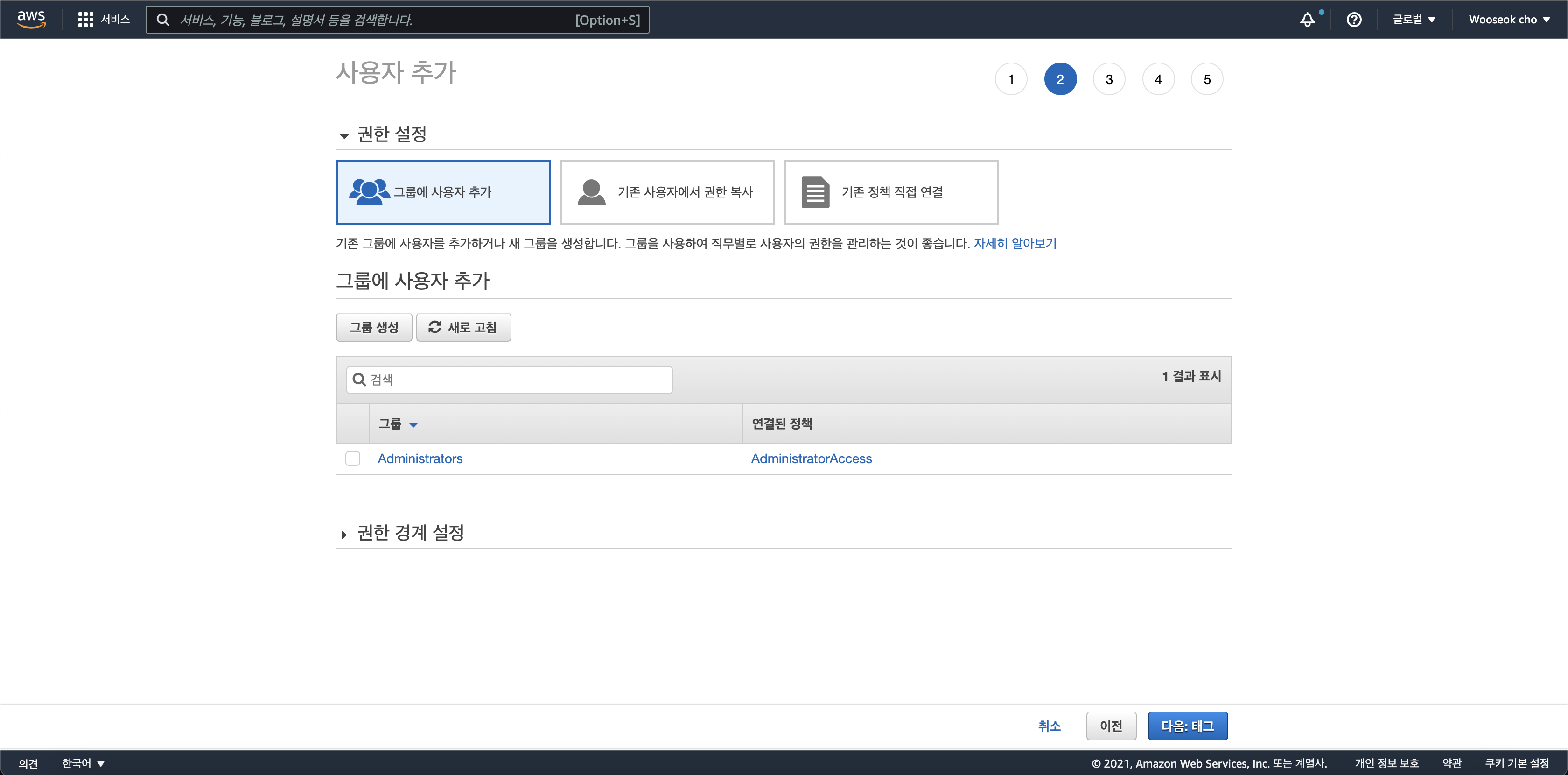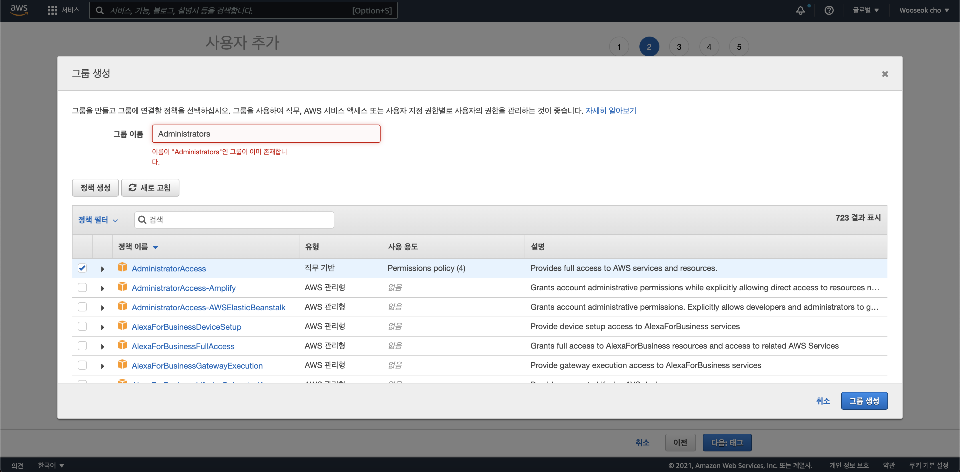 그룹 이름에 "Administrators" 를 입력하고, 정책은 "AdministratorAccess"를 선택한 후, 그룹 생성 버튼을 클릭해줍니다.