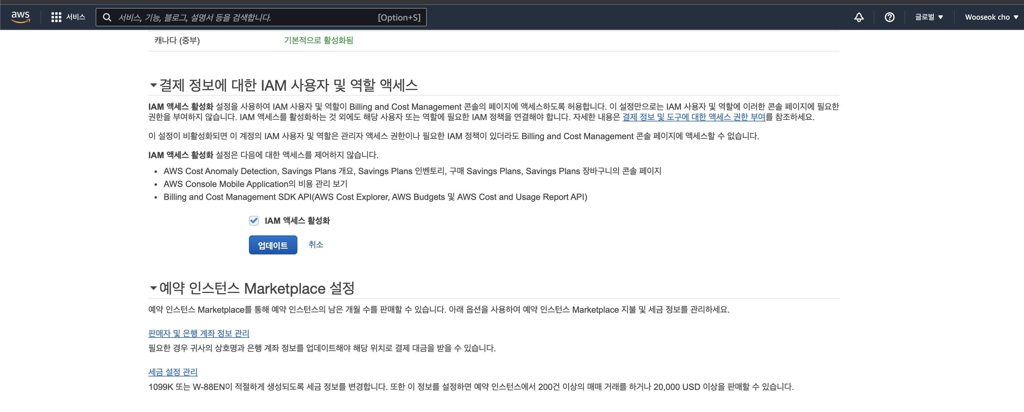 계정 설정에 들어가서 [결제 정보에 대한 IAM 사용자 및 역할 액세스] 를 확인합니다.