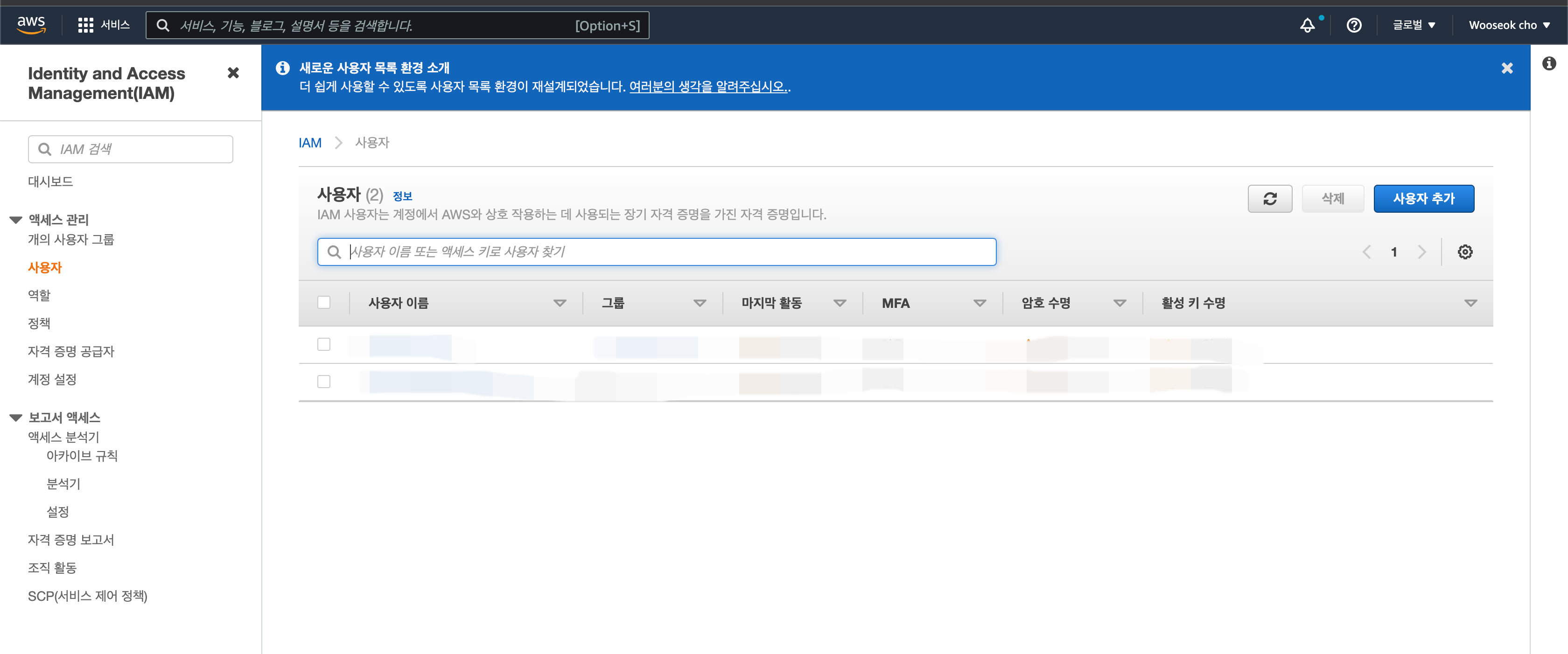 그 후, IAM 웹 콘솔에서 [사용자] 섹션으로 접속합니다.
