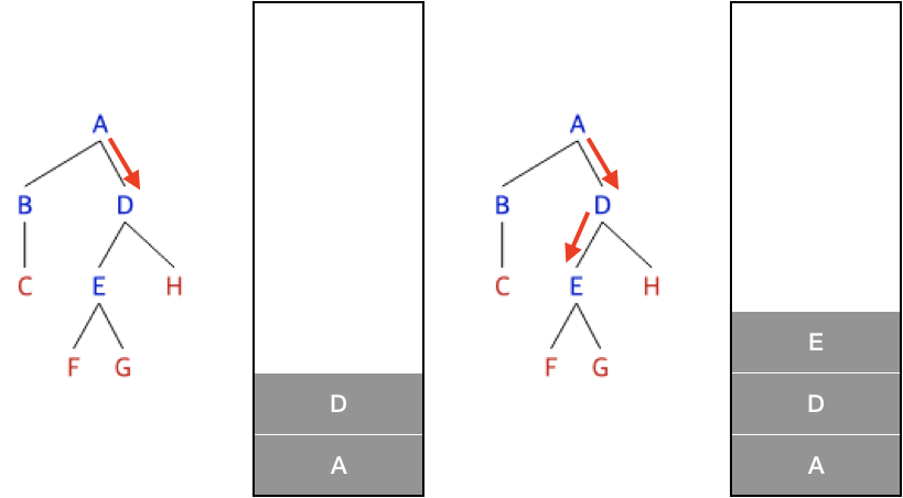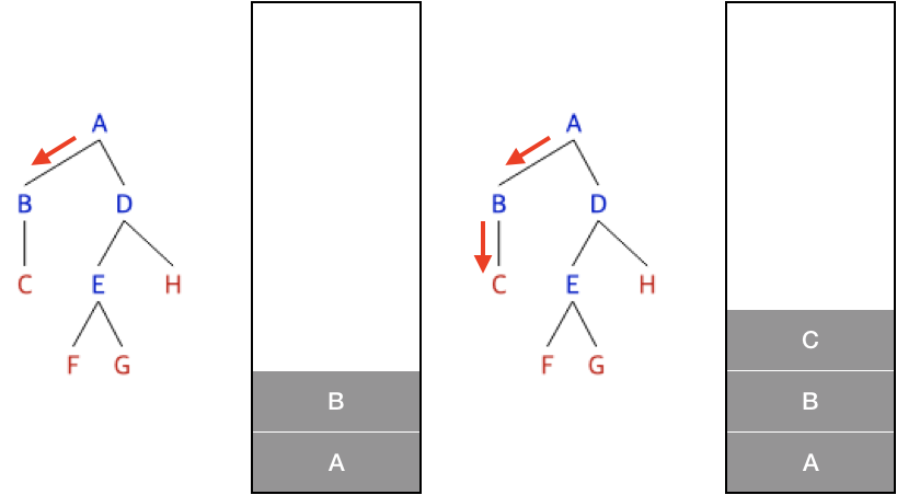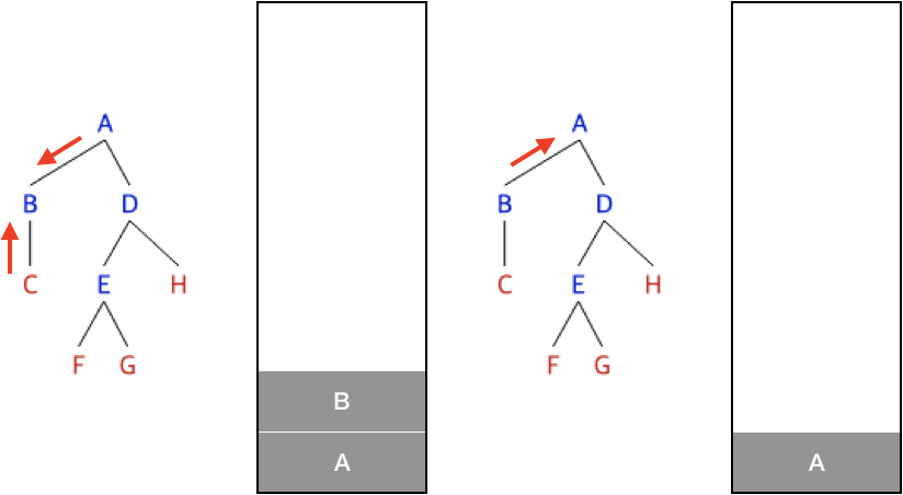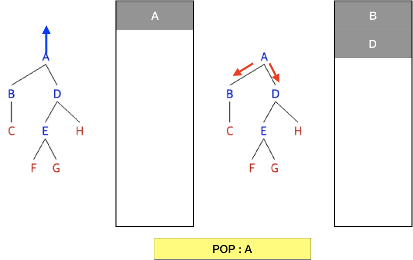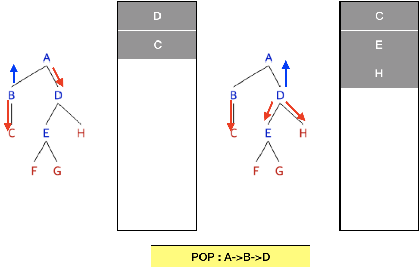 C에서는 분기가 B로 되돌아가며, B에서 갈 수 있는 분기를 모두 갔으므로 다시 A로 돌아가며 다시 분기문 선택에서 B는 이미 탐색을 했으니 D로 간다.