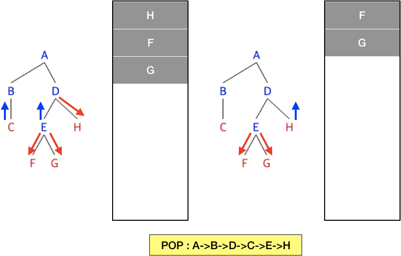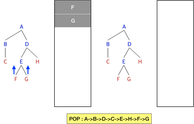 그 후, H와 인접한 정점이 없으므로 H를 pop하고 F,G와 인접한 정점이 없으므로 이 둘도 pop 한다.