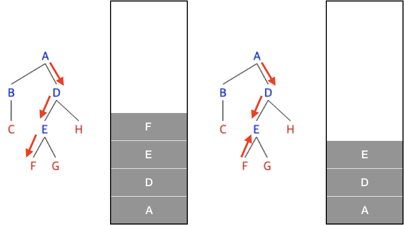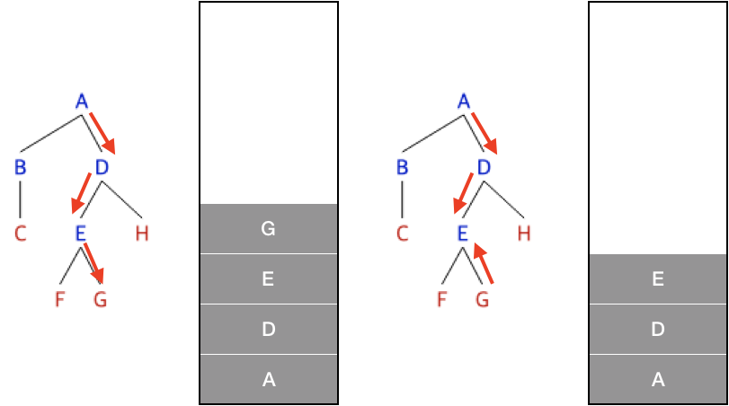 F에서 분기가 없으므로 E로 되돌아가고 E에서 남은 분기인 G로 간다.
