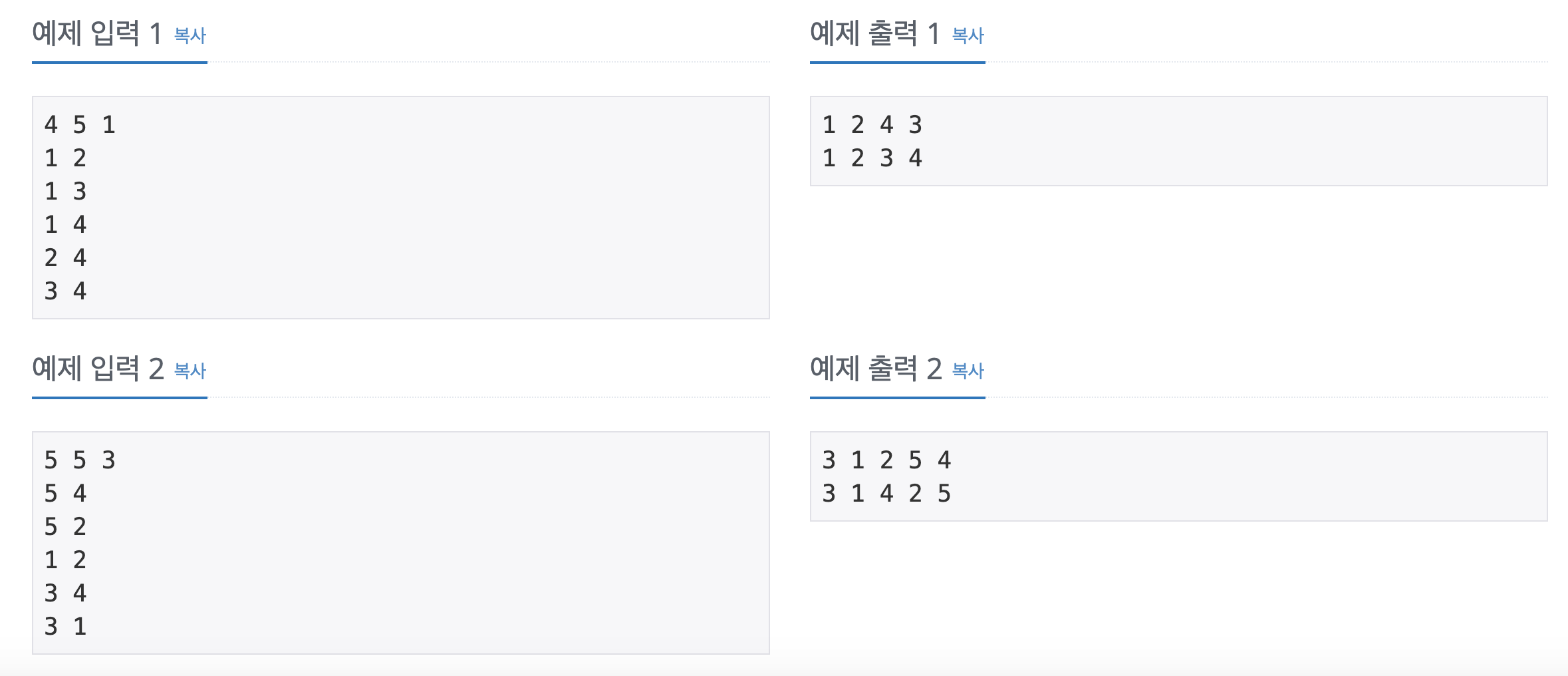 첫째 줄에 정점의 개수 N(1 ≤ N ≤ 1,000), 간선의 개수 M(1 ≤ M ≤ 10,000), 탐색을 시작할 정점의 번호 V가 주어진다. 다음 M개의 줄에는 간선이 연결하는 두 정점의 번호가 주어진다. 어떤 두 정점 사이에 여러 개의 간선이 있을 수 있다. 입력으로 주어지는 간선은 양방향이다.