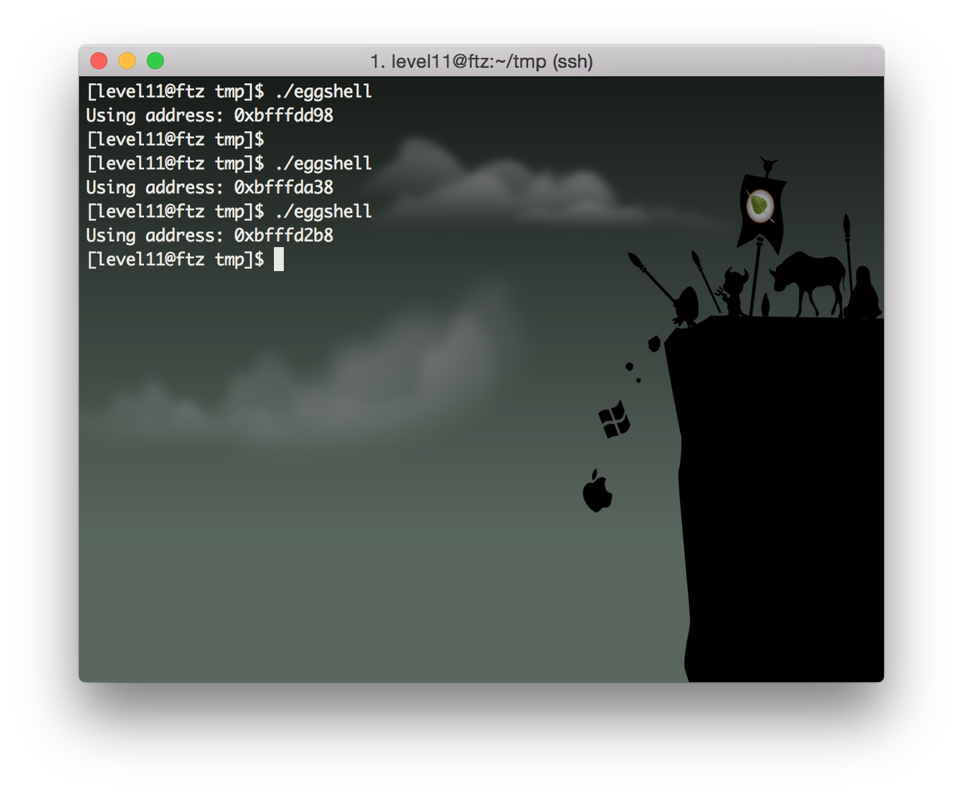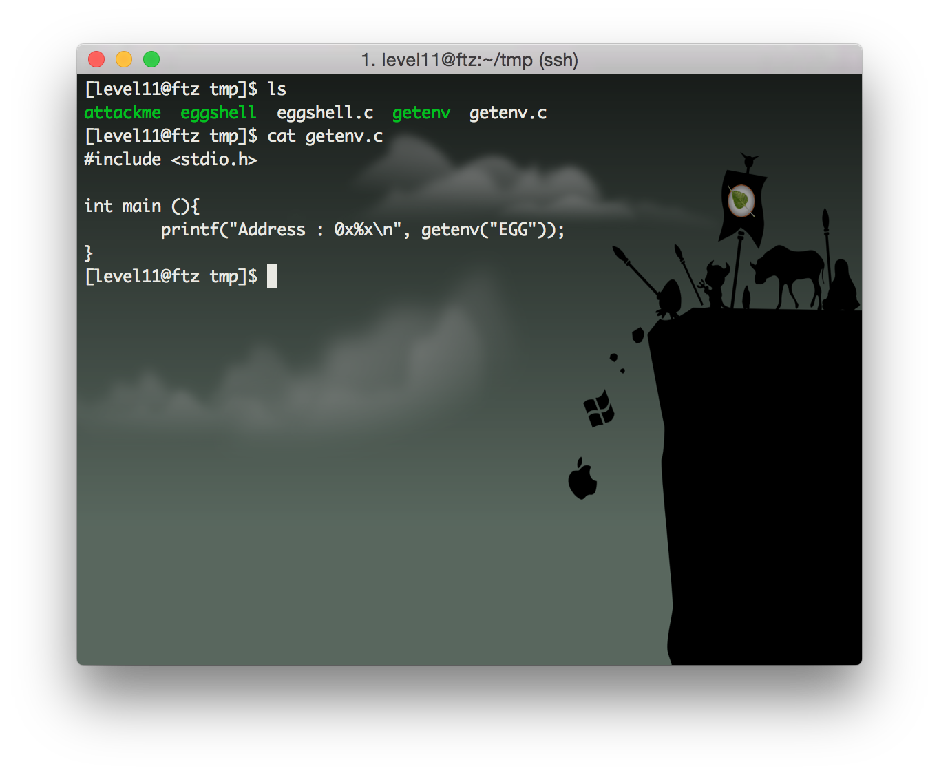 1시간 정도 구글링한 결과 getenv함수(환경 변수 목록중에서 원하는 변수값을 구하는 함수)를 이용하여 에그쉘이 들어있는 환경변수의 정확한 주소를 얻어옵니다.