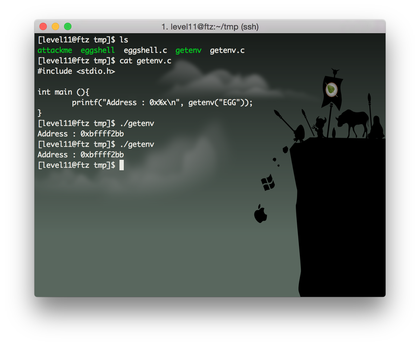 1시간 정도 구글링한 결과 getenv함수(환경 변수 목록중에서 원하는 변수값을 구하는 함수)를 이용하여 에그쉘이 들어있는 환경변수의 정확한 주소를 얻어옵니다.