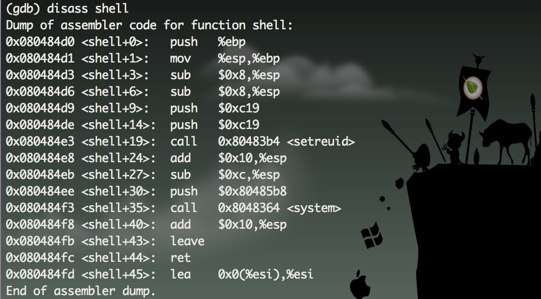 프로그램을 gdb를 사용해 shell함수의 시작 주소를 찾습니다.