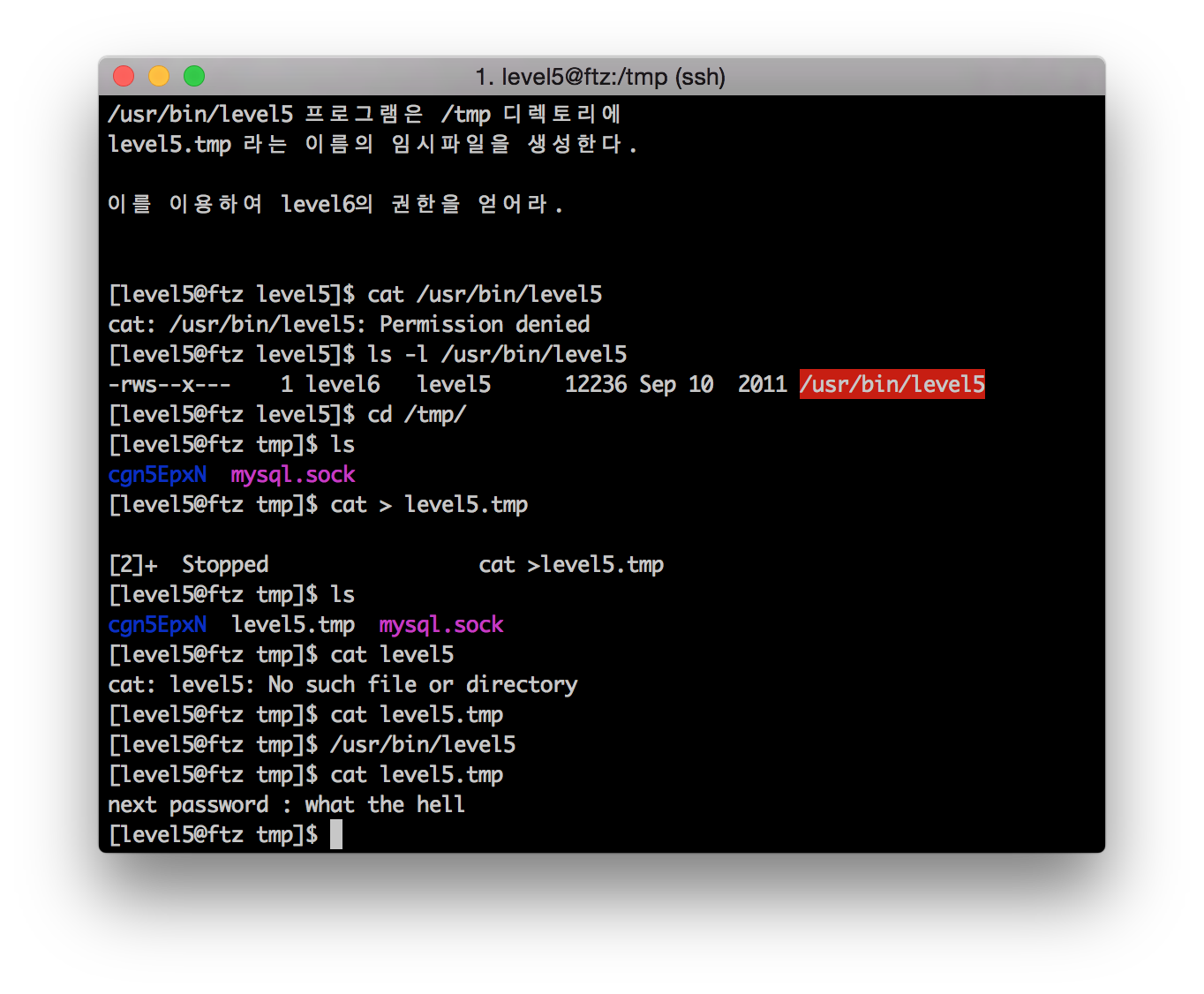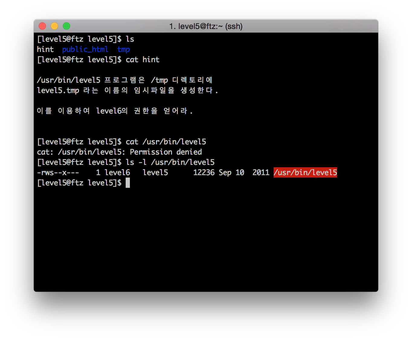 (참고로 /usr/bin/level5 폴더는 읽기 권한이 없어 읽지 못한다.)
