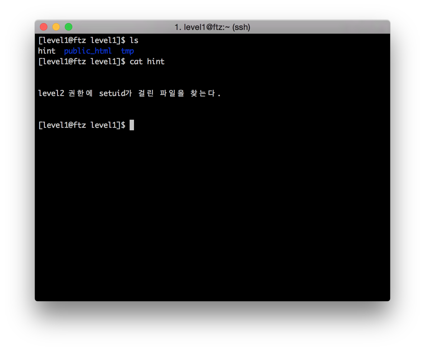 "level2 권한에 setuid가 걸린 파일을 찾는다."라는 힌트가 나와 있습니다.