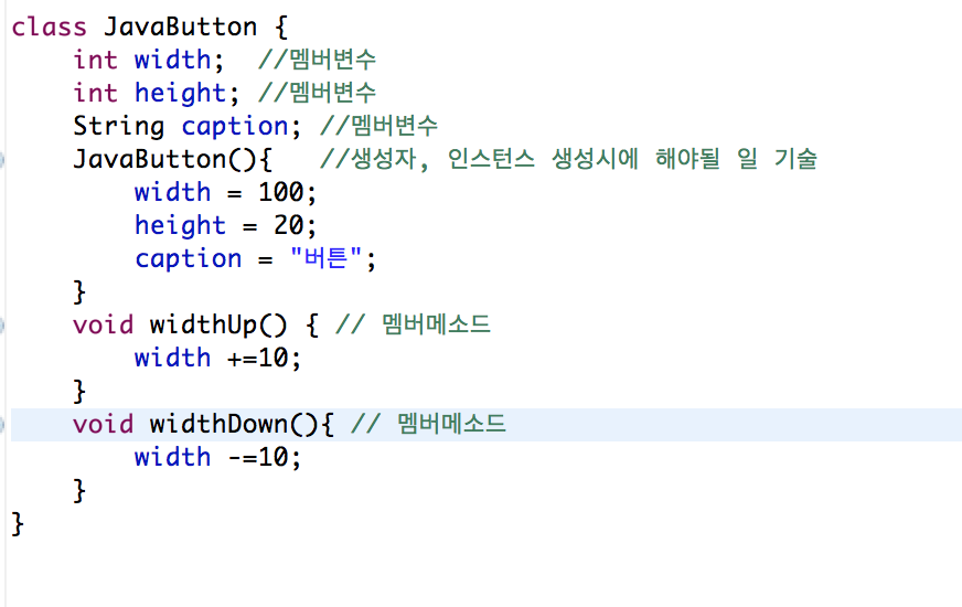 클래스에서 보통 속성은 멤버변수로 정의되고 기능은 메서드로 정의되며 클래스가 생성될때 기본적으로 해야하는 일을 생성자로 정의된다.