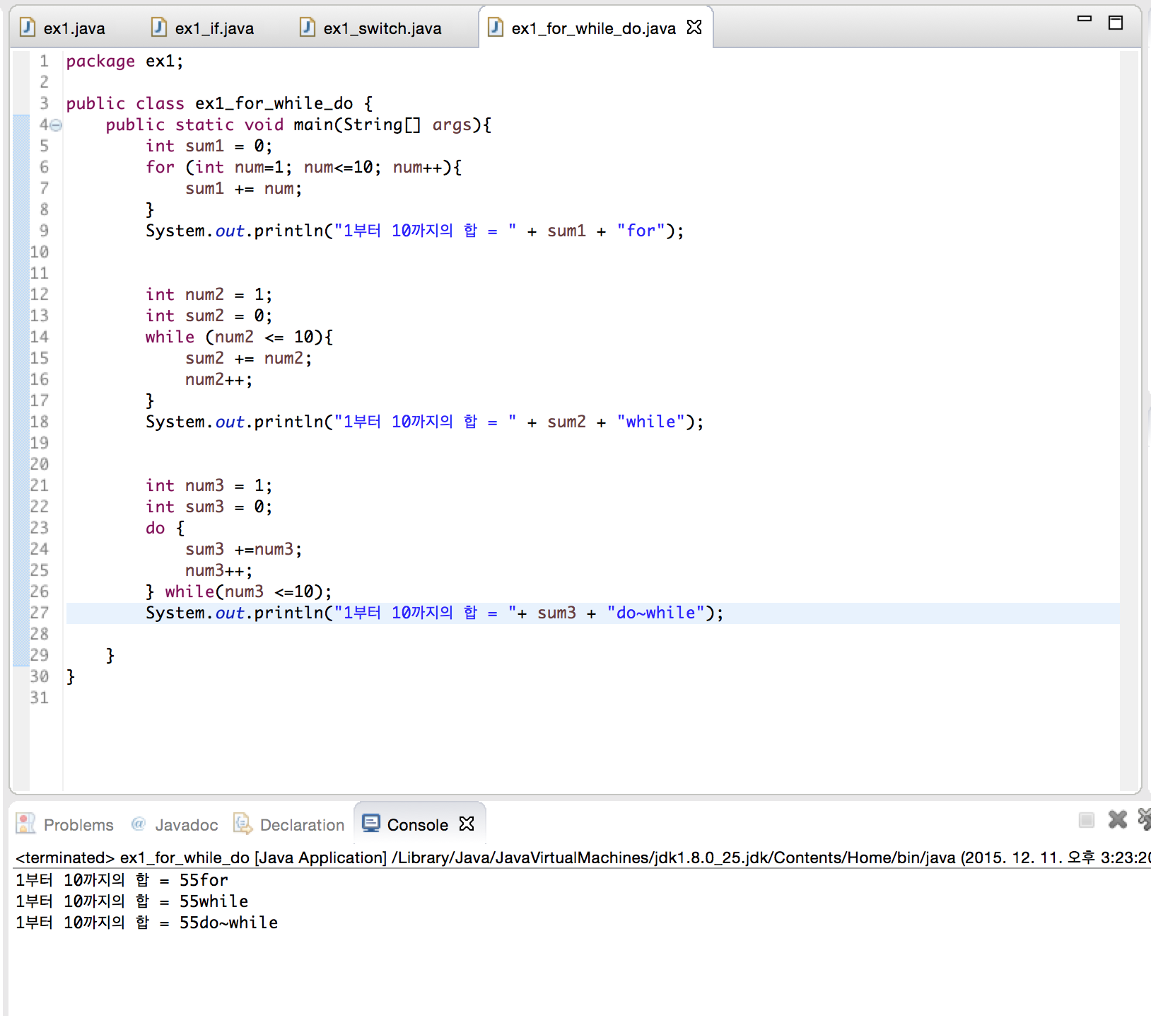 - 조건식을 뒤에 검사한다는 것을 제외하고는 while문과 같다. do문은 최소한 한번은 수행된다.
