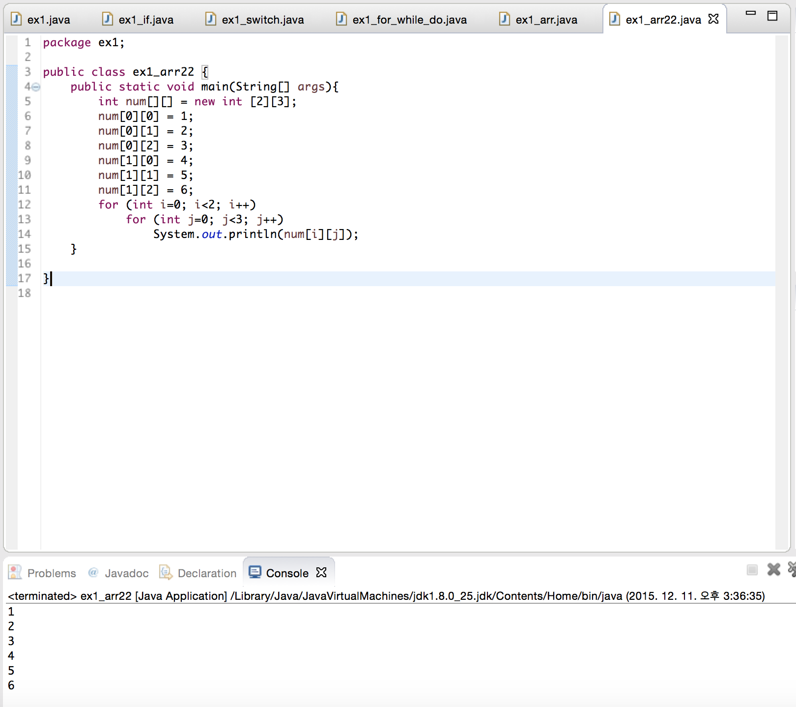 앞에서 배운 for문을 2중으로 중첩하고 2차원의 배열을 사용하면 다음과 같은 프로그램을 작성할 수도 있다.