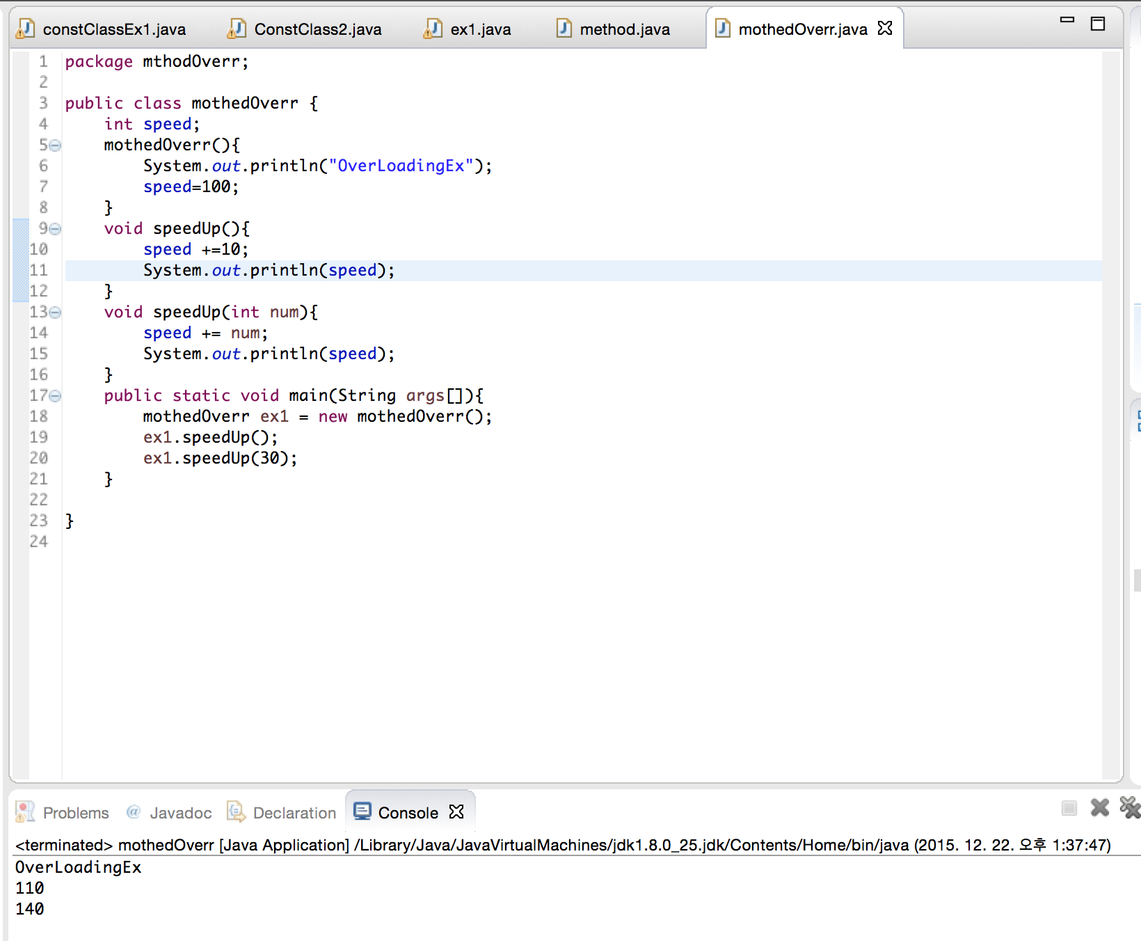 - 생성자 오버로딩과 비슷하지만 오버로딩된 메소드들간의 반환 타입은 같아야한다.