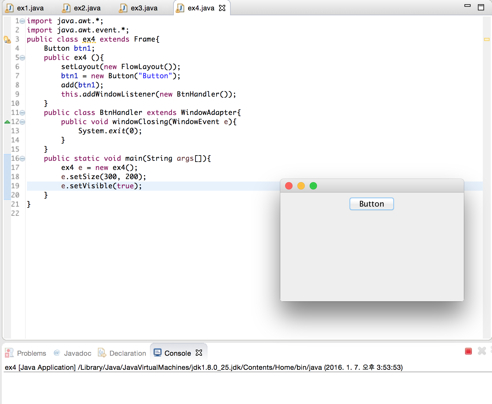 WindowListenerWindowAdapter | windowOpened(WindowEvent e)windowClosing(WindowEvent e)windowClosed(WindowEvent e)windowActivated(WindowEvent e)windowDeactivated(WindowEvent e)windowIconified(WindowEvent e)windowDeiconified(WindowEvent e)windowStateChanged(WindowEvent e)windowGainedFocus(WindowEvent e)windowLostFocus(WindowEvent e) | 윈도우 열기윈도우 닫기윈도우 종료윈도우 활성화윈도우 비활성화윈도우 아이콘화윈도우 비아이콘화윈도우 상태변화윈도우 포커스 얻음윈도우 포커스 잃음 |