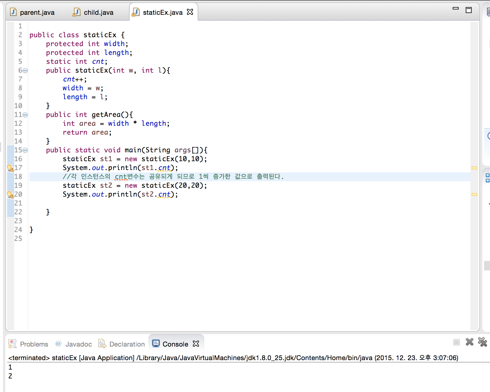 멤버변수나 메소드를 포함한 클래스 자체의 내용에 모든 인스턴스가 공유하므로, 전역변수처럼 사용되어진다.