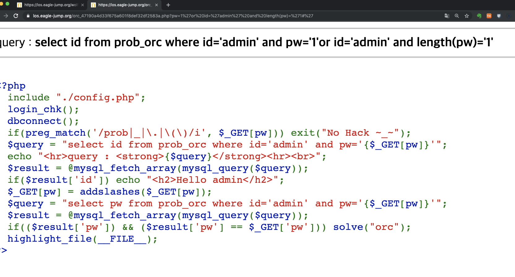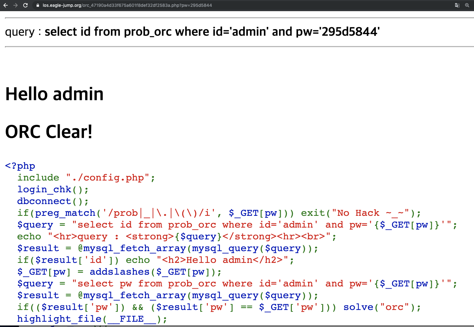 그리고 처음 입력한 pw와 addslashes 처리된 pw가 일치하면 orc를 풀어준단다.