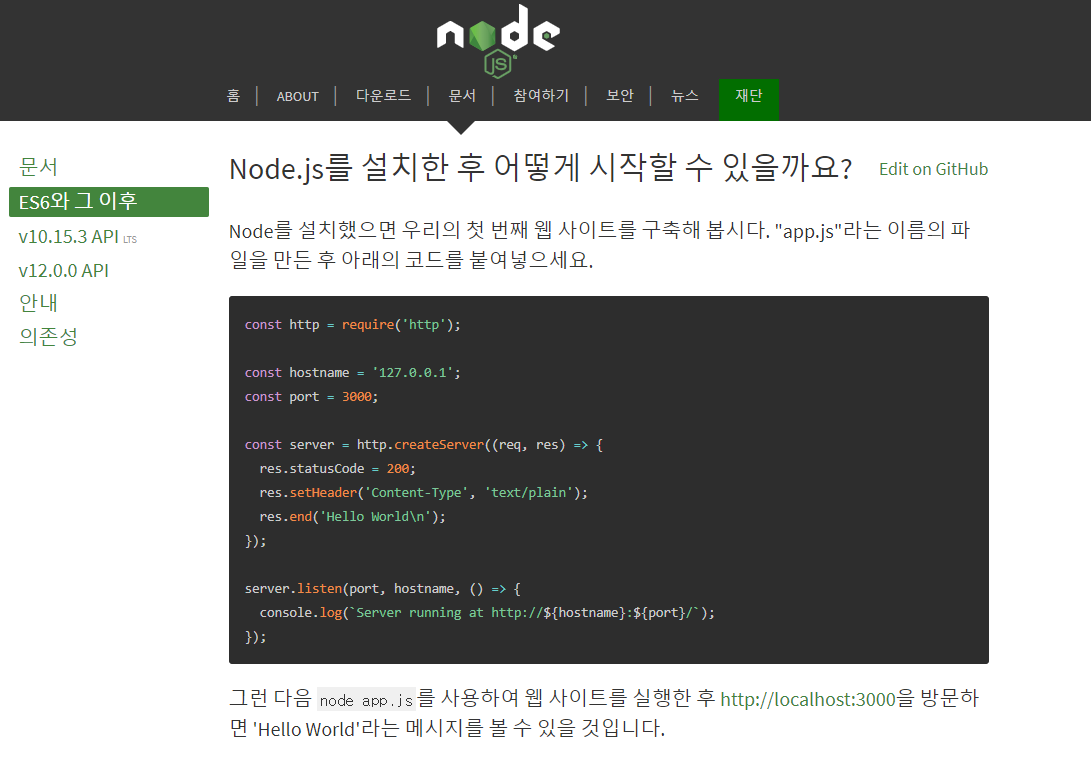 NodeJS와 관련된 가이드 문서 또는 내용도 공식 홈페이지에서 제공하고 있다.