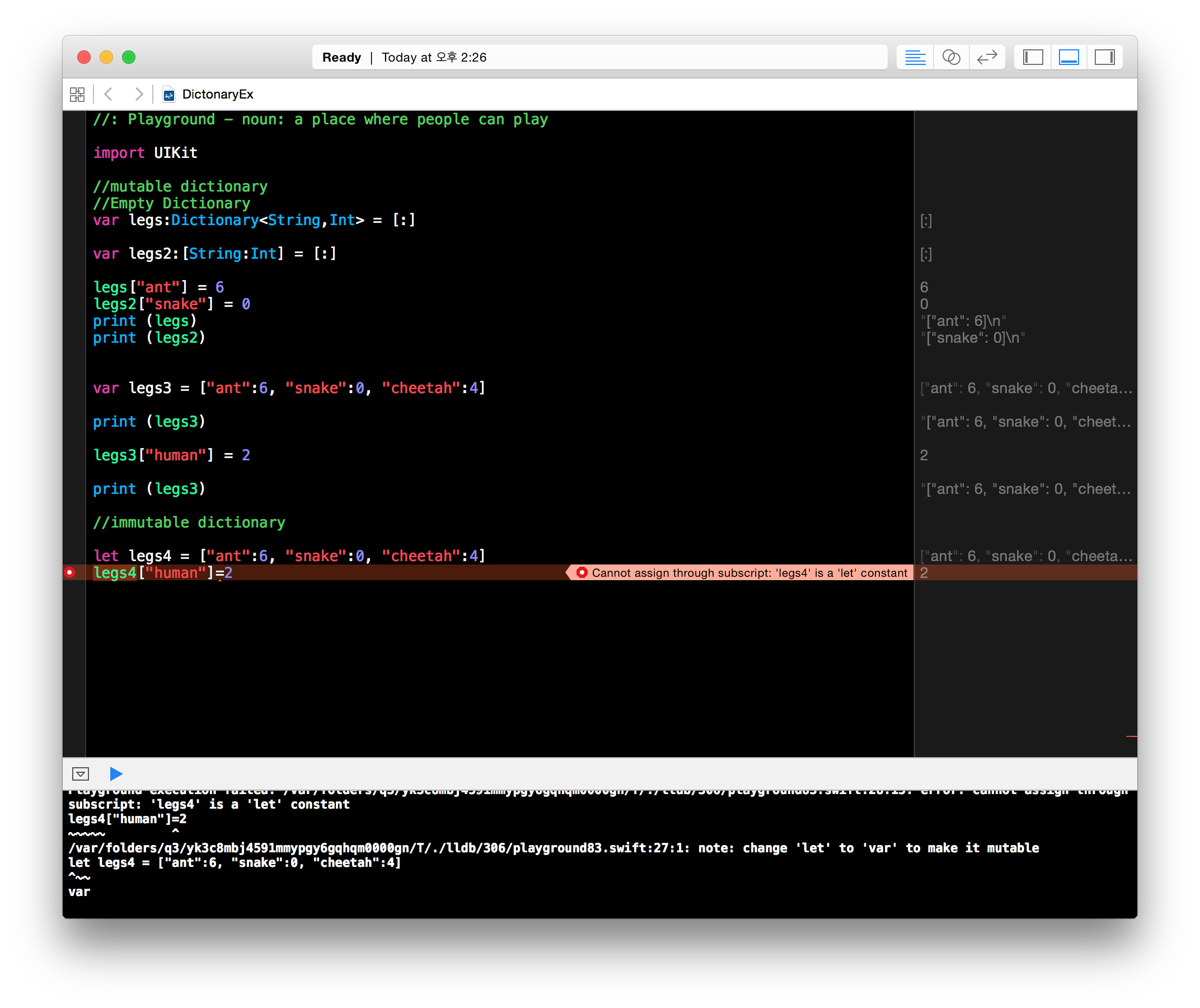 Dictionary도 마찬가지로 var과 let에 따라 mutable or immutable 이 됩니다.