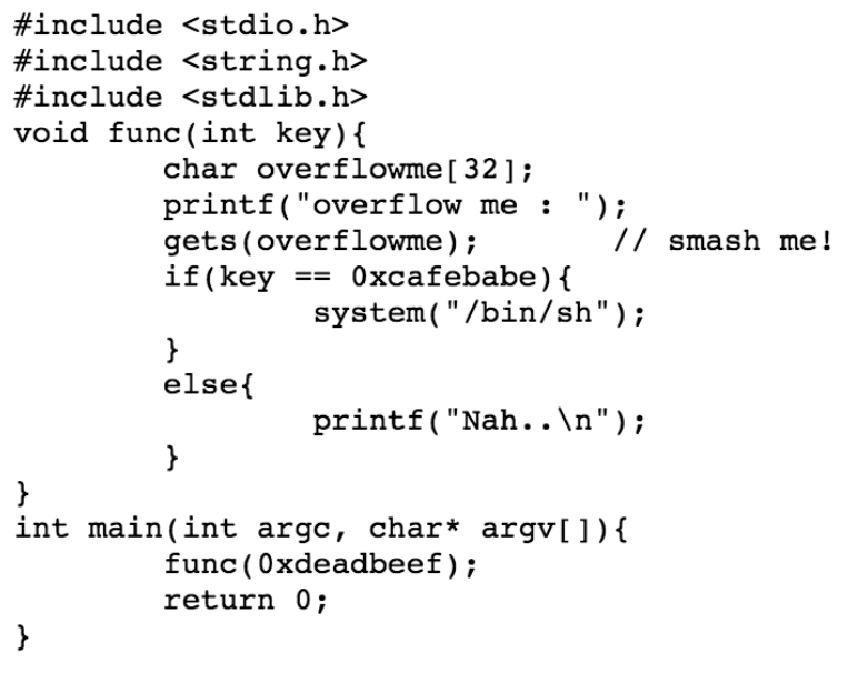 func에 넣은 인자 deadbeef를 를 오버플로우를 통해 cafebabe로 바꿔주면 된다.