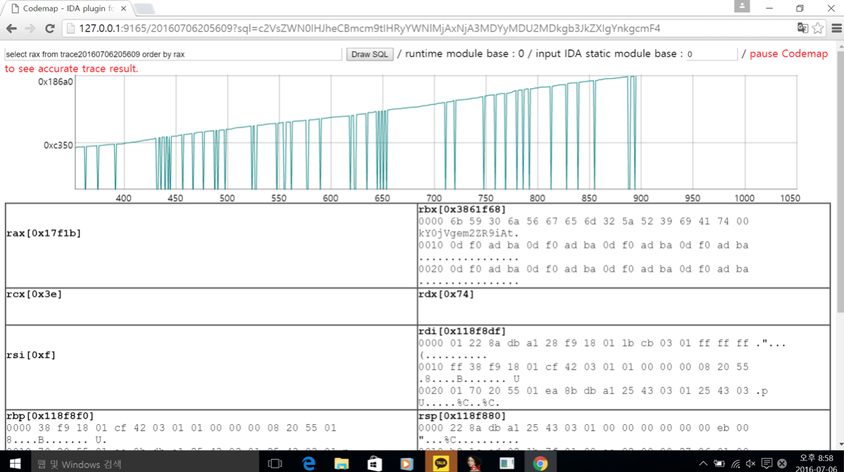 힌트로 준 0x403E65에 BP를 걸고 local win 32 debuger로 돌린후 일시정지하고 코드맵을 킨 후, 프로그램을 모두 동작시켜 주면 DB에 BP를 기준으로 자원들이 저장됩니다. 그리고 쿼리를 날려서 읽어오면 되요!!